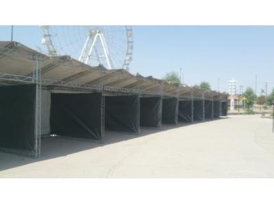 - اجاره چادر و اسپیس که دارای چادر ضد آب میابشد و جنس سازه هم آلمینیومی میباشد . در طول 25 متر و عرض 20 متر